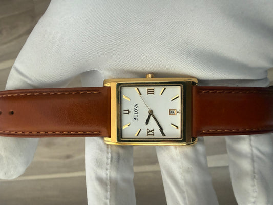 Bulova rectangular dress watch, gold-tone case on a leather strap, quartz movement