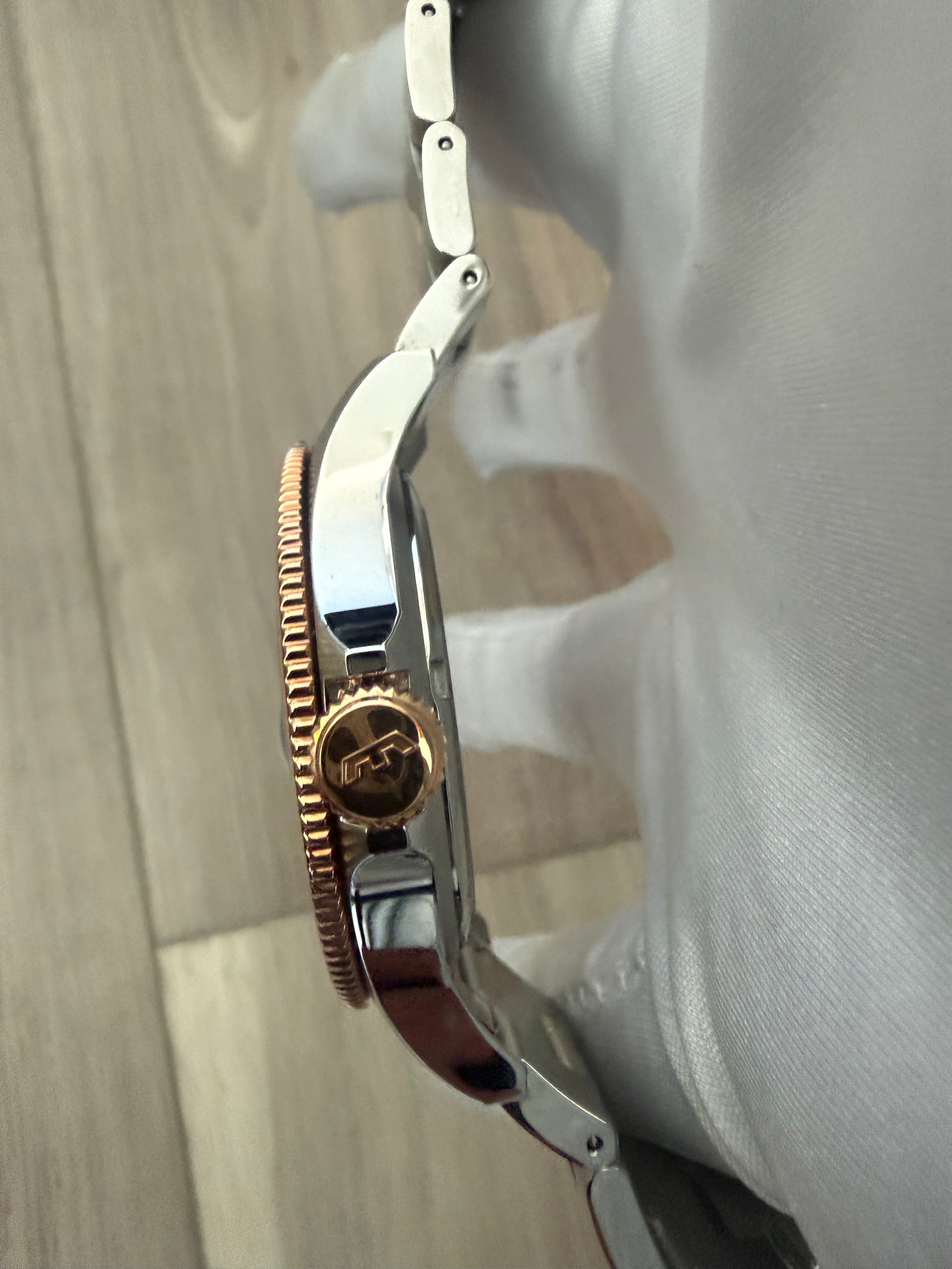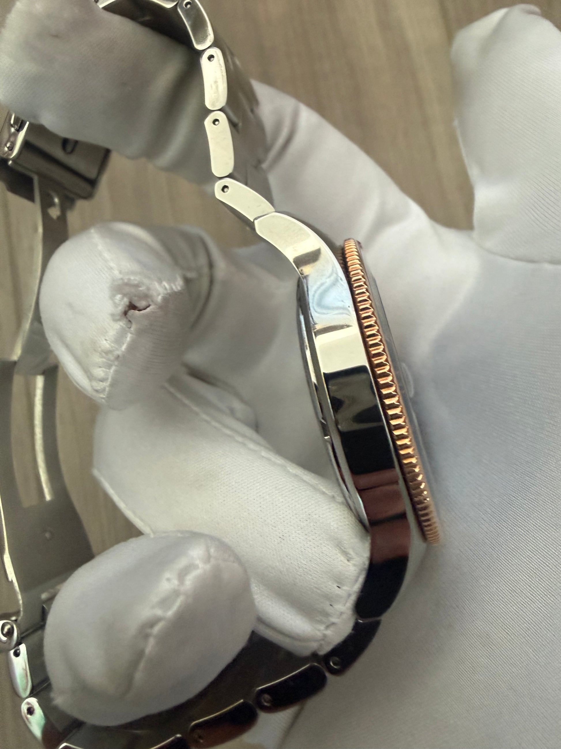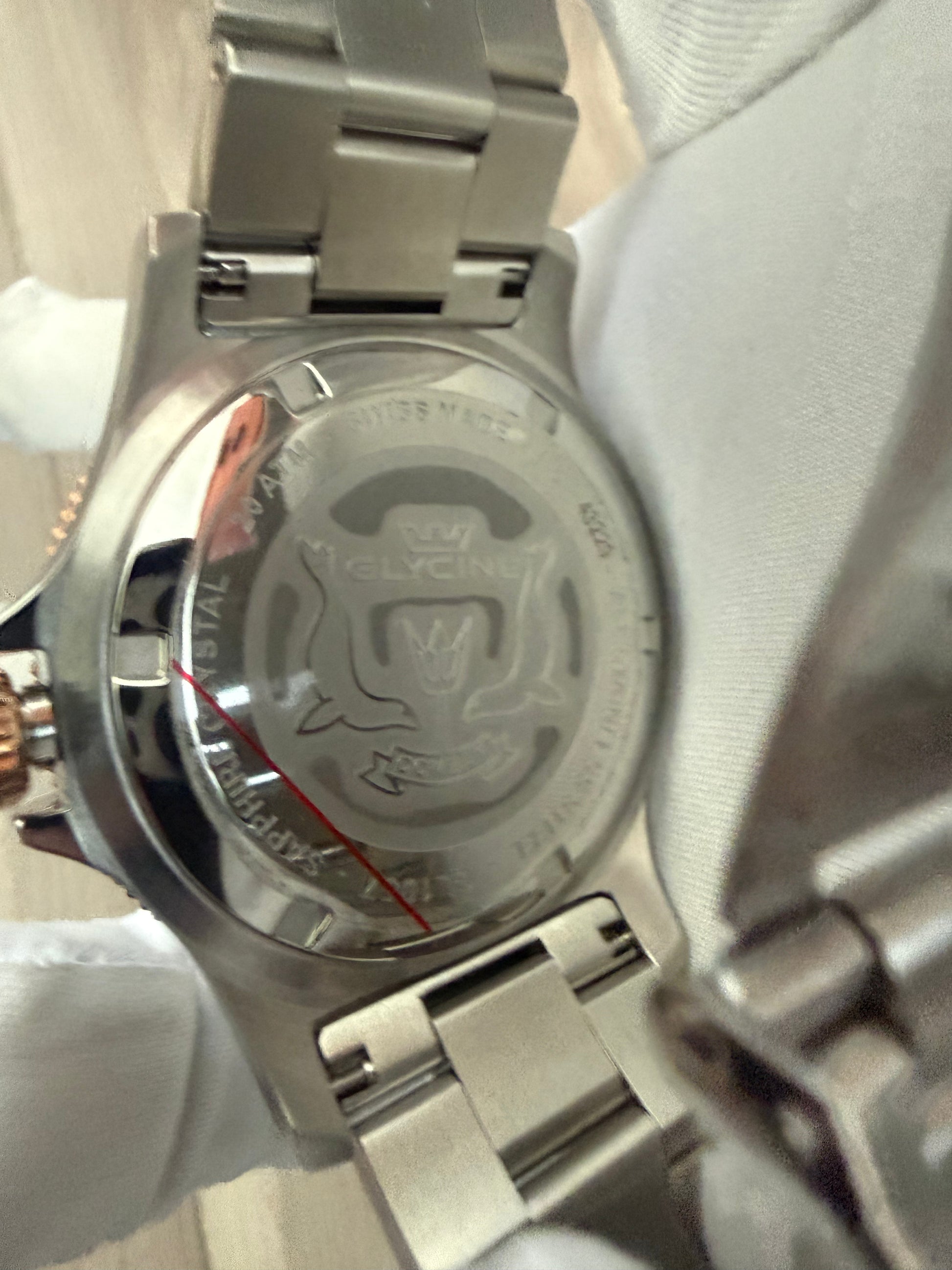 | • Model: Glycine Combat Sub GMT • Case Size: 42mm stainless steel • Movement: Swiss quartz (GMT / dual time zone) • Dial: Black dial with luminous hands & markers • Bezel: Blue 24-hour GMT rotating bezel • Crown: Rose-gold tone screw-down crown • Crystal: Scratch-resistant sapphire crystal • Water Resistance: 200 meters / 660 feet • Bracelet: Stainless steel bracelet with secure clasp • Functions: Hours, minutes, seconds, date, GMT hand • Swiss Made |